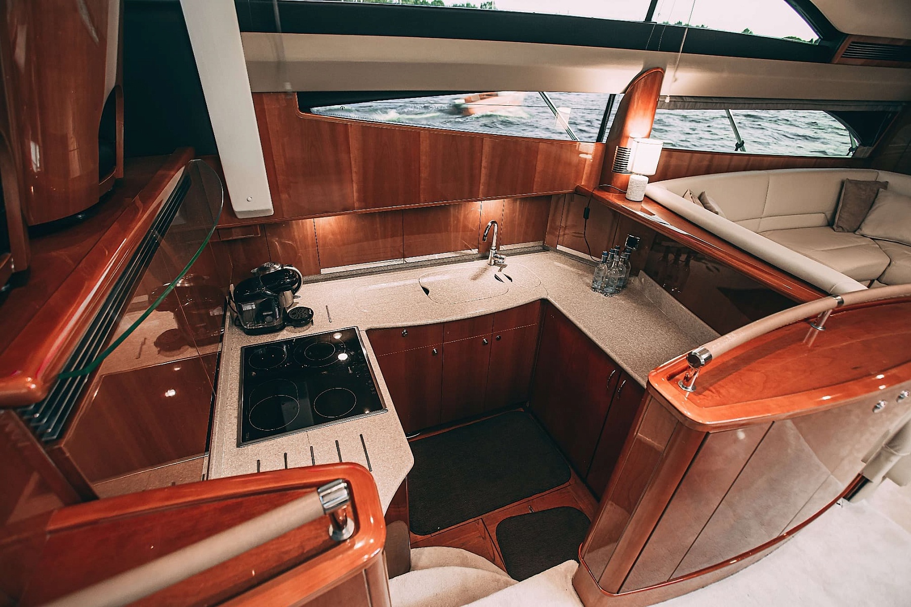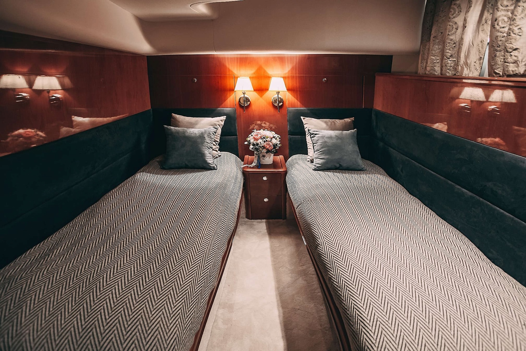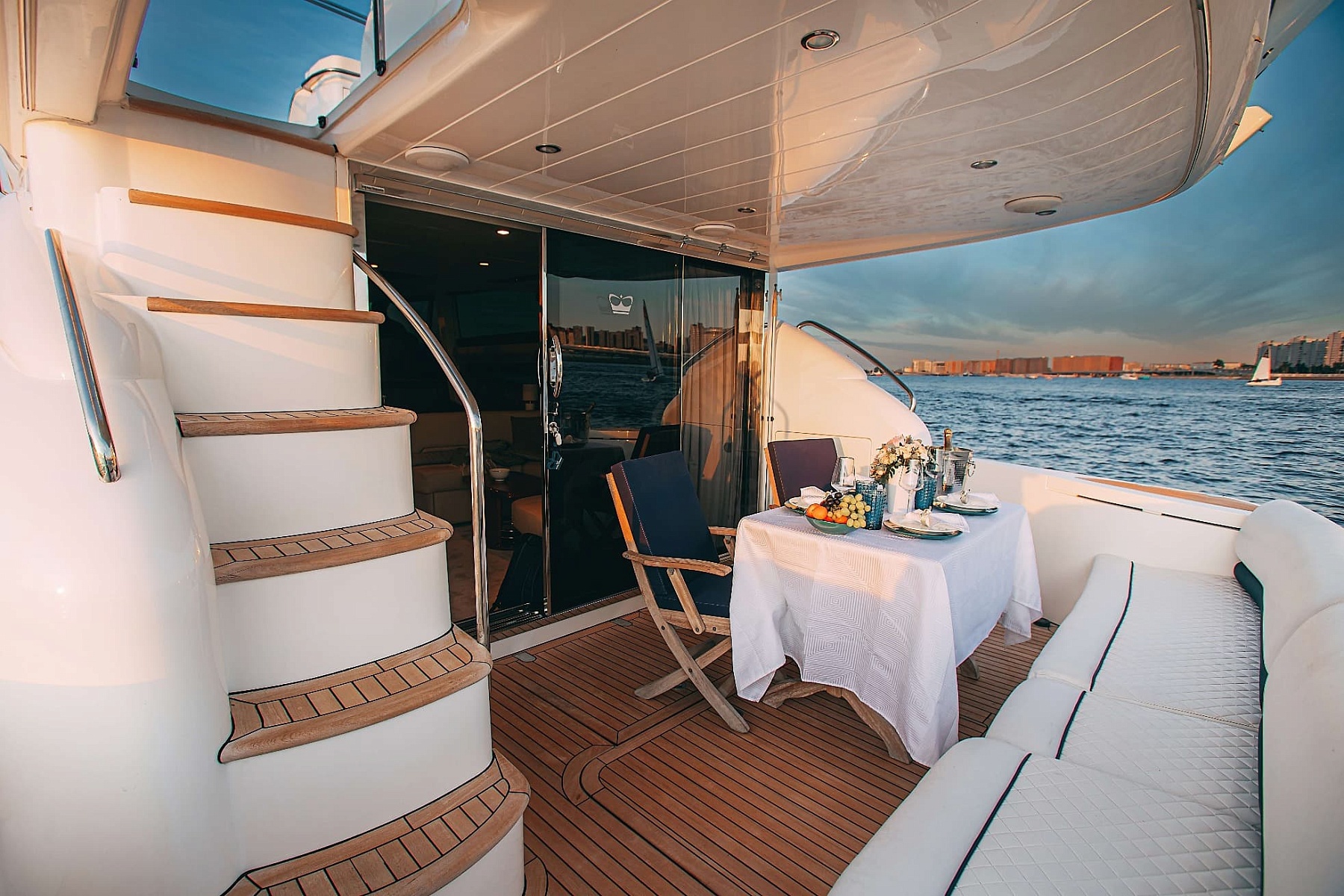 Флайбридж с шезлонгами для загара и открытая зона с диванами и столиками на втором уровне позволят насладиться свежим воздухом и шикарными видами на набережную Санкт-Петербурга. Для вашего удобства на борту оборудованы 2 уборные, душ, уютные каюты, бар, кухня, а также аудиосистема с поддержкой Bluetooth и телевизор. Все продумано до мелочей: теплые пледы, чай, кофе и питьевая вода для всех гостей.