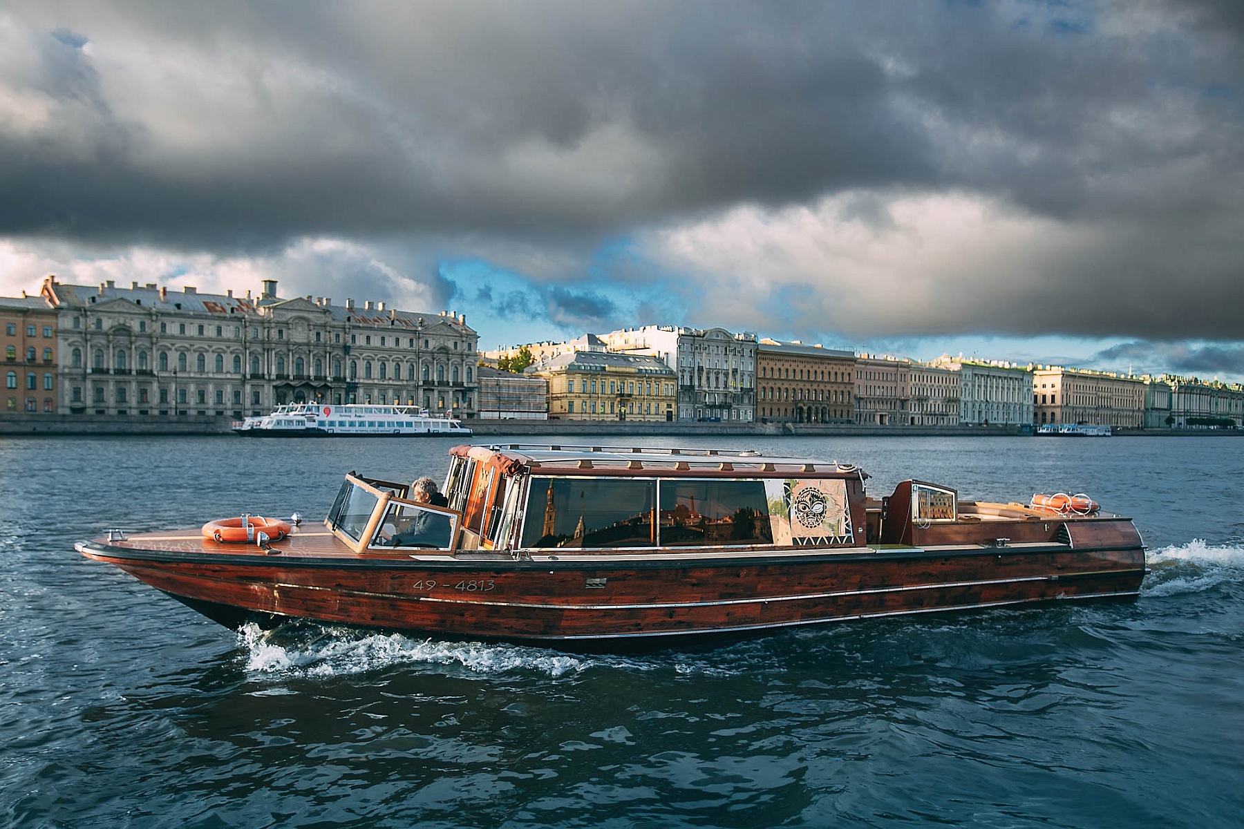 Крытый салон с кожаной мебелью позволит насладиться поездкой в любую погоду. Внутри катера есть мини-кухня для приготовления закусок, удобная уборная, а также система кондиционирования и отопления, что обеспечит комфортный отдых при любой температуре. Для развлечений на борту предусмотрен телевизор с караоке и мощная аудиосистема. Теплые пледы согреют гостей в прохладную погоду.